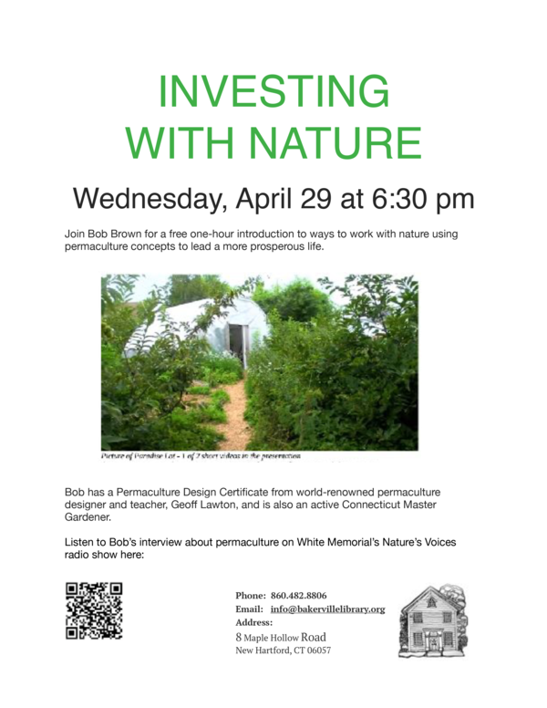 Join Bob Brown for a free one-hour introduction to ways to work with nature using permaculture concepts to lead a more prosperous life.
